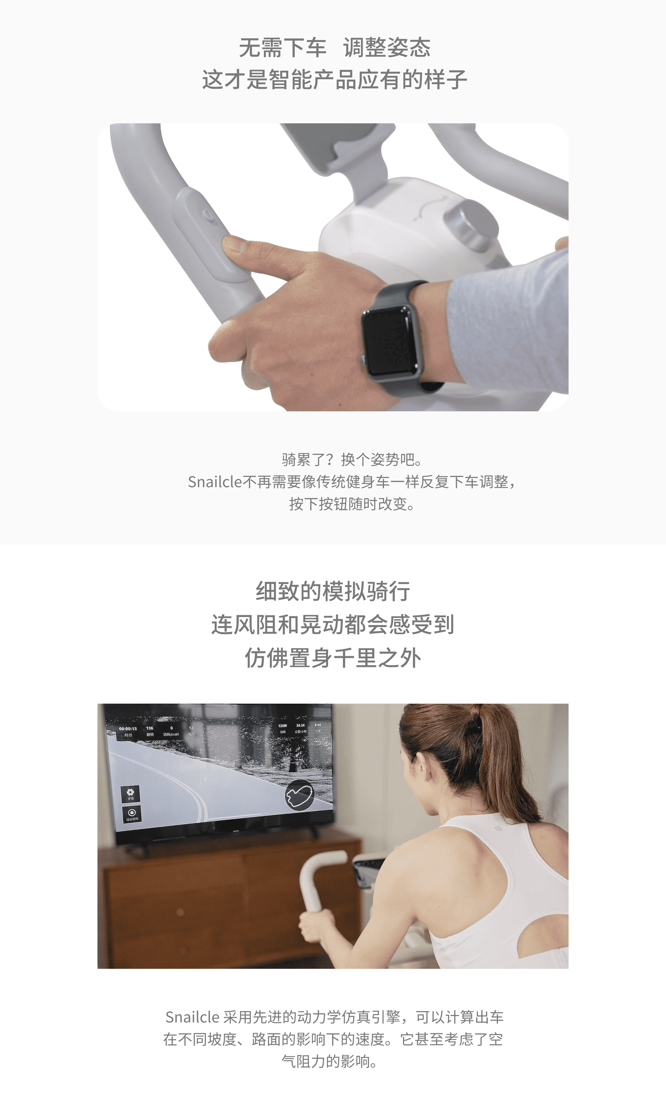 产品基本参数:外形小巧可爱,智能升降,AI姿态识别,骑行仿真。采用先进的动力学仿真引擎,可以计算出车在不同坡度、路面的影响下的速度。智能高频电磁控,比传统电磁控提高52%的反馈速度,比阻力