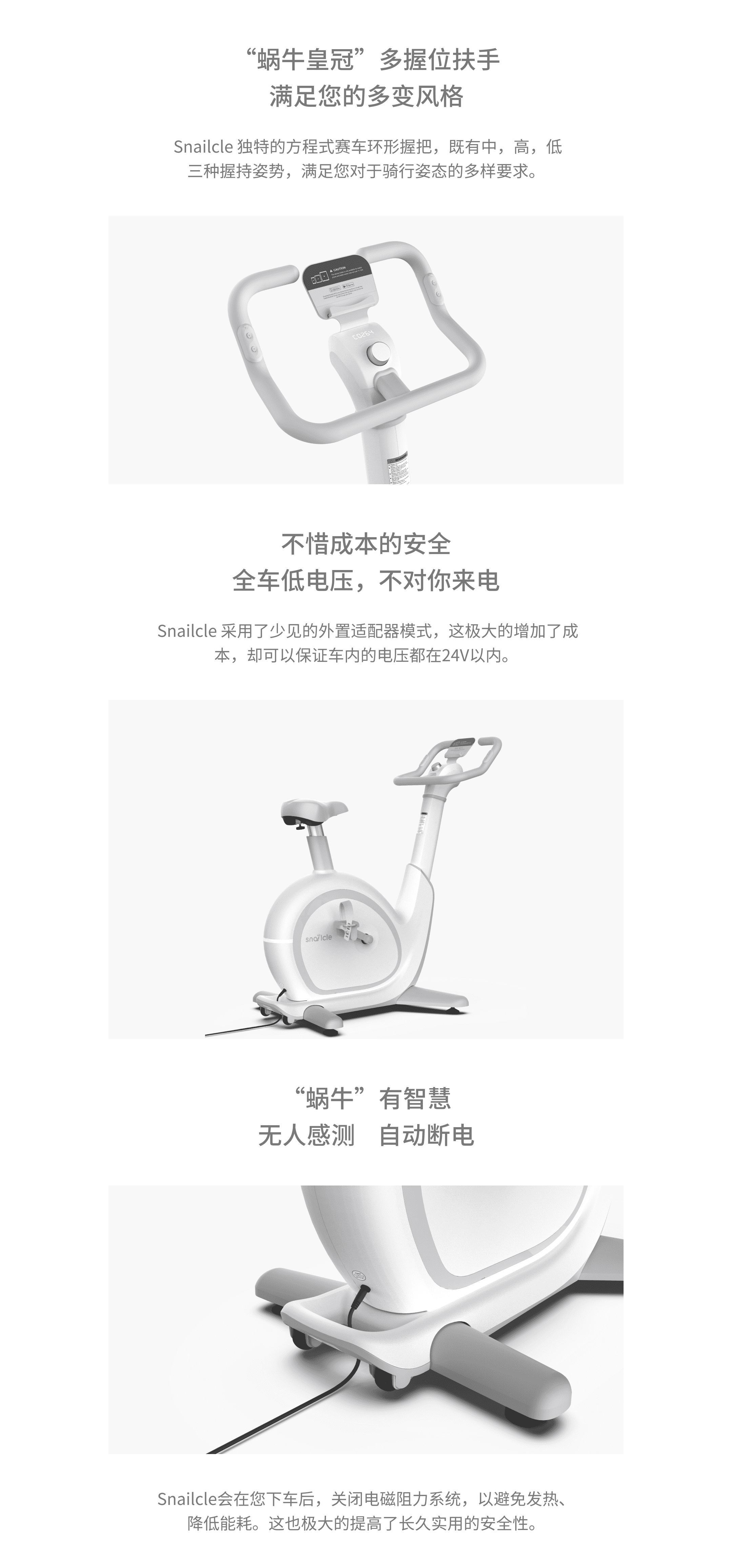 全车低电压,车内电压24V以内,无人自感、自动断电 ,在骑行下车后,关闭电磁阻力系统。